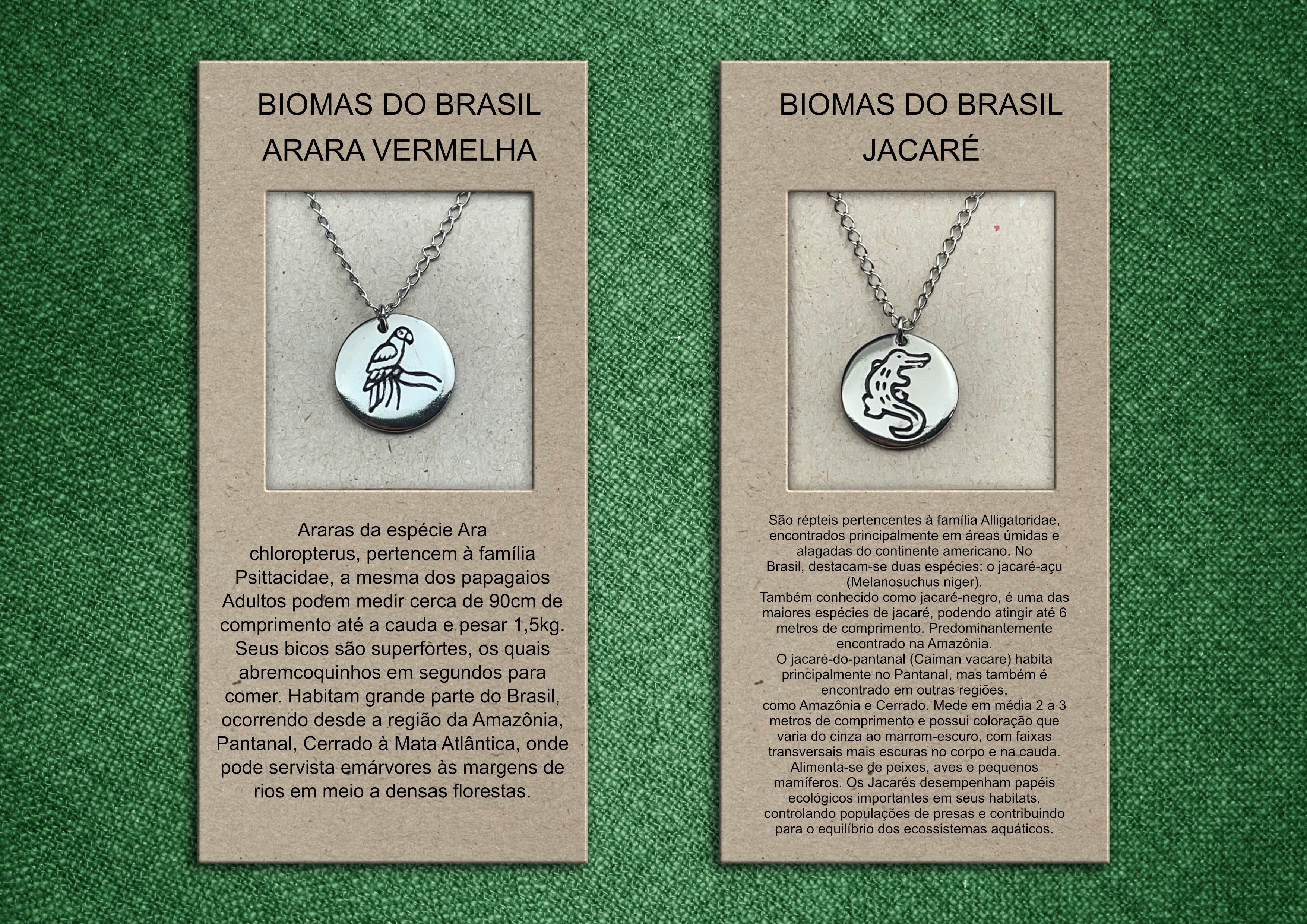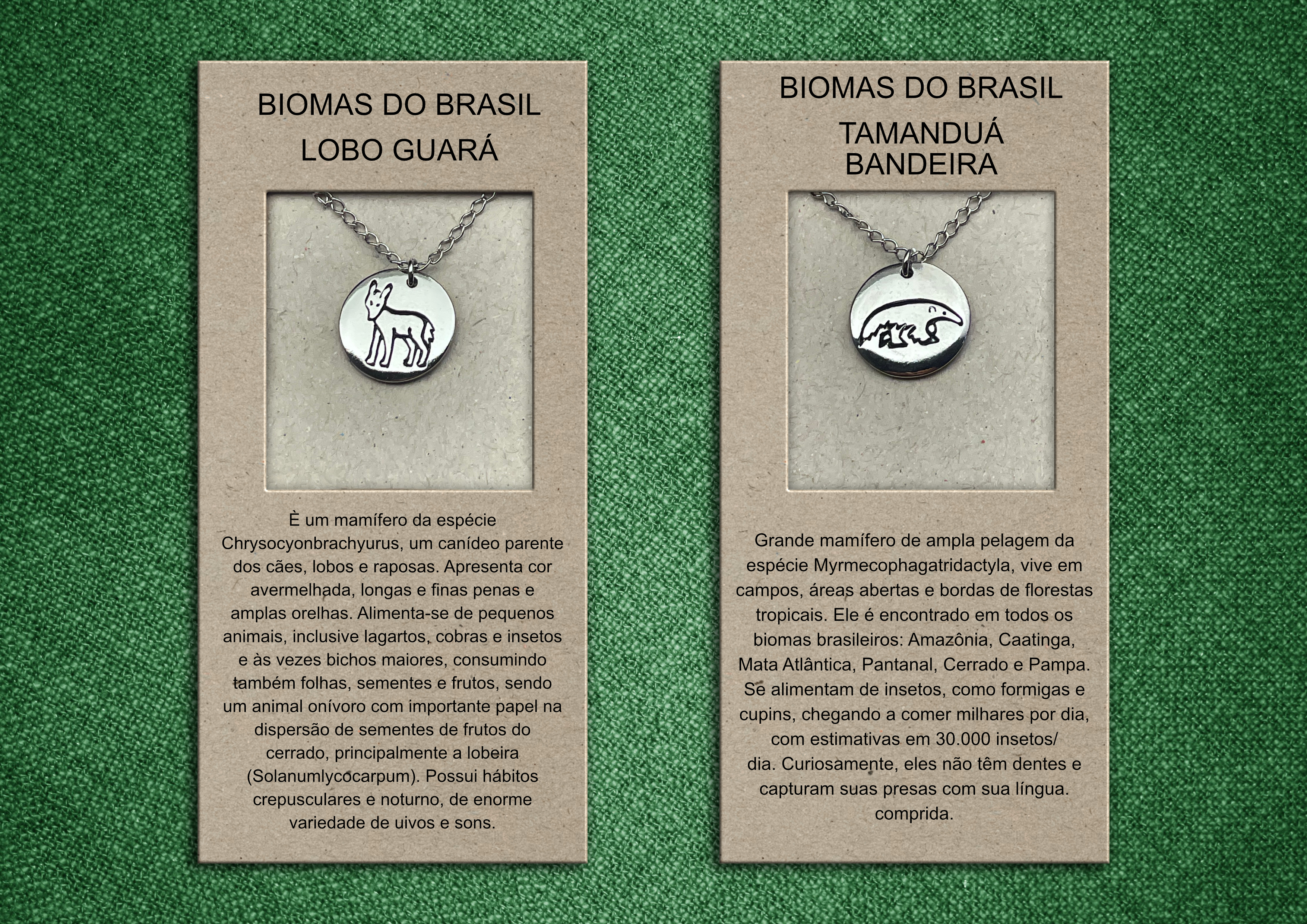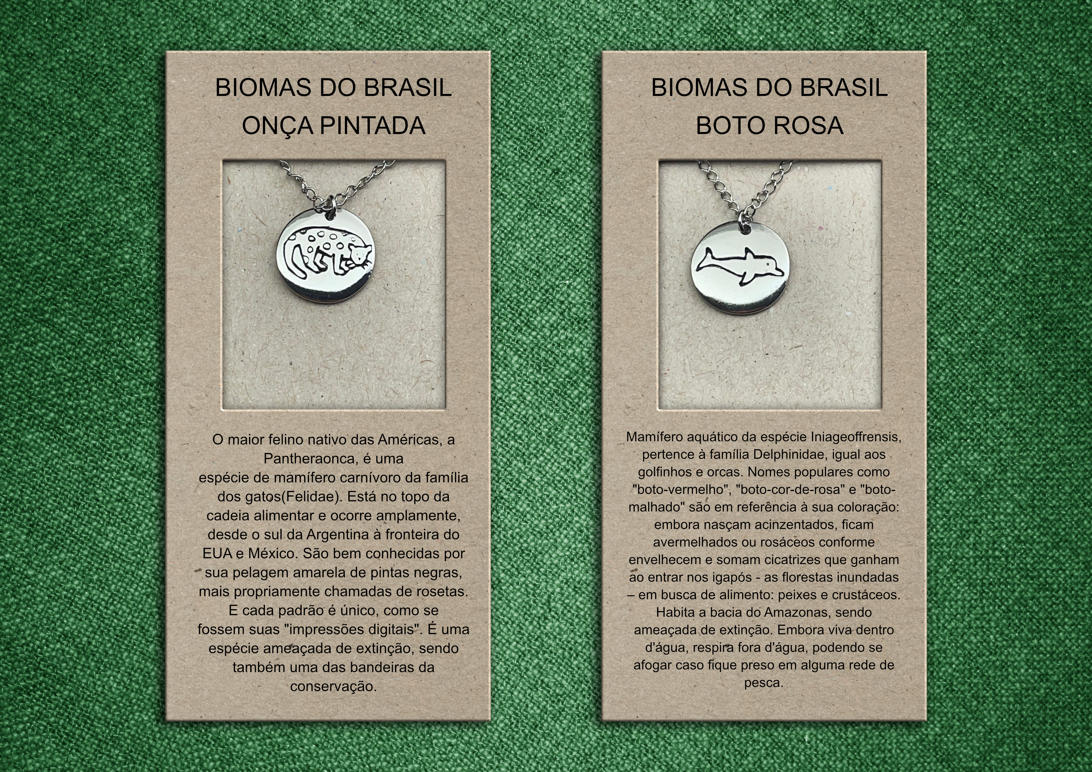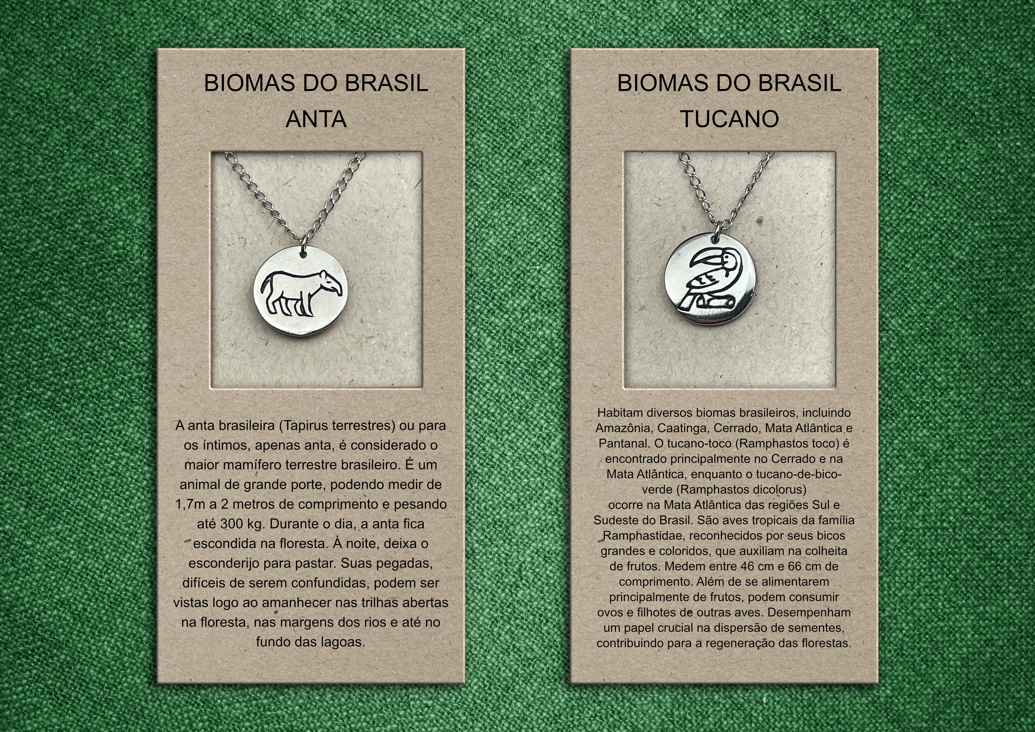 Todas as peças são confeccionadas em bijuteria, com pingentes medindo 1,5 cm de diâmetro, apresentando ilustrações entalhadas de animais do bioma brasileiro.